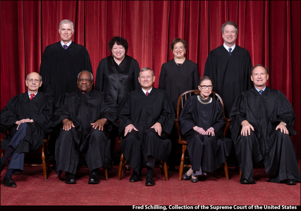 Front row, left to right: Associate Justice Stephen G. Breyer, Associate Justice Clarence Thomas, Chief Justice John G. Roberts, Jr., Associate Justice Ruth Bader Ginsburg, Associate Justice Samuel A. Alito. Back row: Associate Justice Neil M. Gorsuch, Associate Justice Sonia Sotomayor, Associate Justice Elena Kagan, Associate Justice Brett M. Kavanaugh. (Photo: Fred Schilling, Collection of the Supreme Court of the United States)
