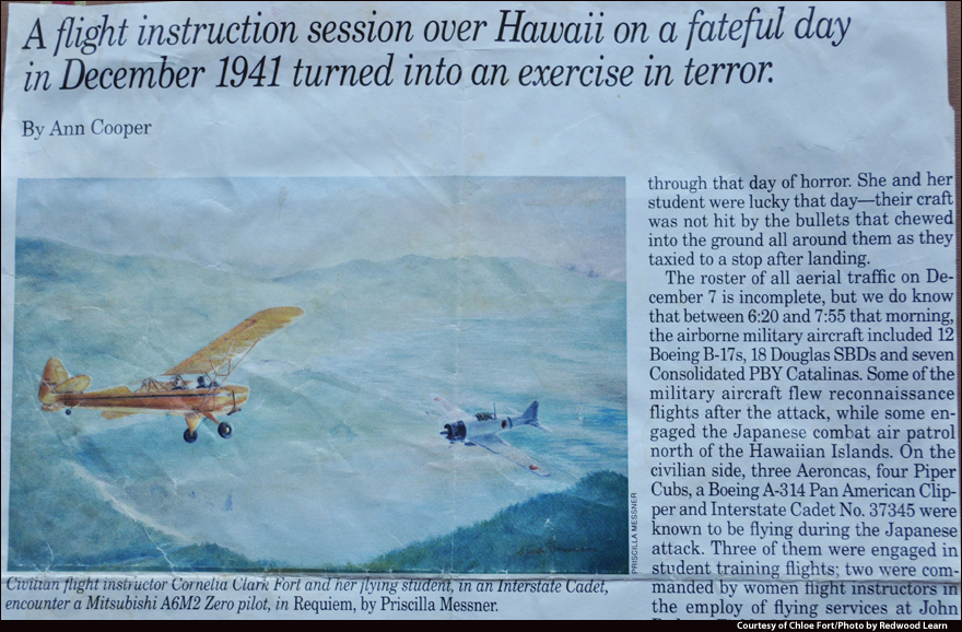 Nov. 17, 2021 – Early on Dec. 7, 1941 in Honolulu, Hawaii, Cornelia Fort, 22, was doing what she loved to do. She was in the air instructing a student pilot. They were flying a bright blue and yellow Interstate Cadet, a training aircraft. With her student at the controls, Cornelia spotted Japanese aircraft and knew the planes were not friendly. She grabbed the controls from her student. The U.S. Naval Base at Pearl Harbor was under a surprise attack. Cornelia landed safely. Cornelia was likely the first or one of the first to realize what was happening on that beautiful Sunday morning.