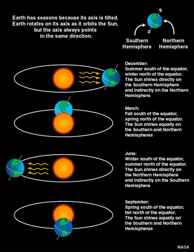 Earth rotates on its axis that is tilted at about 23 degrees, which is the reason for the four seasons. NASA has an excellent graphic to explain this phenomenon.(See below) Note that Earth is always tilted in the same direction. When it is summer in the Northern Hemisphere, it is winter in the Southern Hemisphere. Study the graphic below.