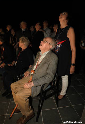 Dr. Eugene Parker watches the launch of the spacecraft that bears his name – NASA’s Parker Solar Probe – early in the morning of Aug. 12, 2018. NASA Director of Heliophysics Dr. Nicky Fox stands behind him. (Photo: NASA/Glenn Benson)