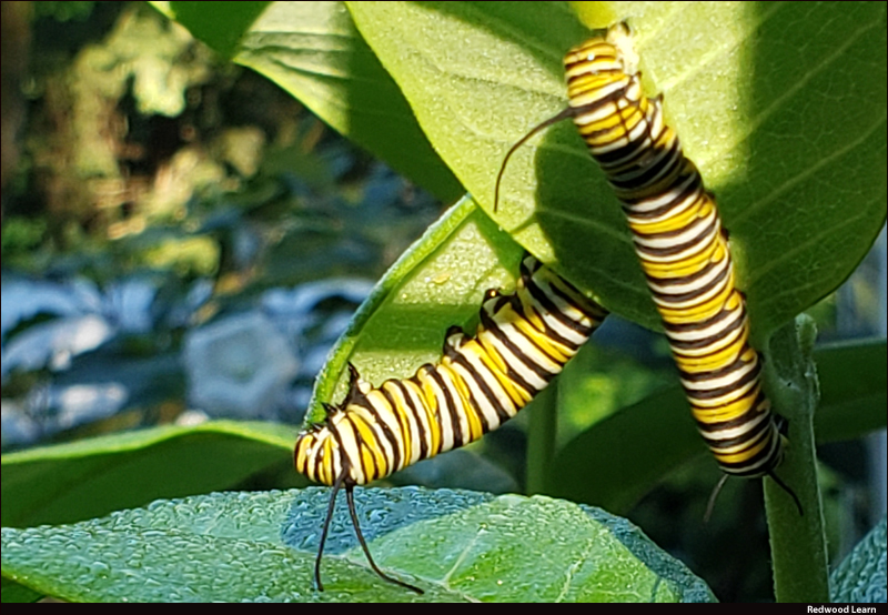 During the past 20 years, the number of monarchs has been declining. The U.S. Fish and Wildlife Service (USFWS) and many other agencies have launched a campaign to “Save the Monarch” by providing habitat – milkweed plants. Female monarchs lay their eggs on milkweed plants where the eggs develop into beautiful caterpillars that eat a lot of milkweed! This is the larva. As the caterpillar grows it sheds its exoskeleton. The process is called molting.