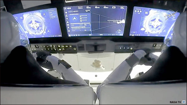 For those who watched the space shuttle missions in the 1980s through 2011, the scene inside the Dragon spacecraft looks very different and very futuristic. The shuttle dashboard with an array of knobs, switches and dials, state-of-the-art 1990s technology, is gone.
