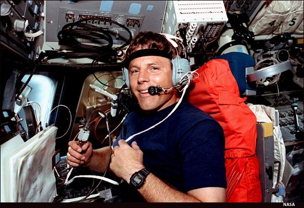 Experiment II (SAREX-II) while sitting at the pilot’s station on the forward flight deck. Oswald is talking to amateur radio operators on Earth via the SAREX equipment. SAREX cables and the interface module freefloat in front of Oswald.