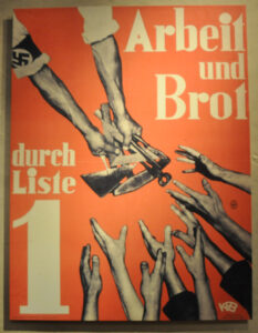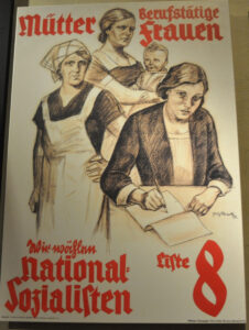 One poster depicts women of all ages in different roles. After trying to decipher the poster’s propaganda, Mark explained the message for the masses was that the Nazi party was not only for men but also for women. While it was true women could join the Nazi party, there was not one woman in a position of leadership, Mark explained. Through graphics, women are favorably depicted in the political poster (see below) in order to earn their vote at the ballot box. It was the poster’s sole purpose. The poster is an example of propaganda that was partially true but with an overall message that was false.