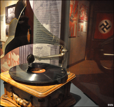 On display at the exhibition is a vintage phonograph. The Nazi party had its own record label producing vinyl records containing both popular music and propaganda. “It built the hipness factor,” Mark said. And the Nazis cleverly practiced what is now known as ‘niche marketing’ by targeting different groups of people with different records.